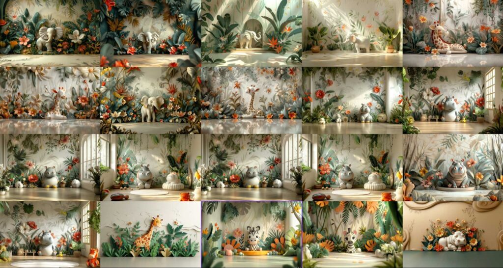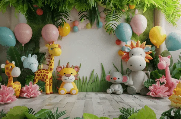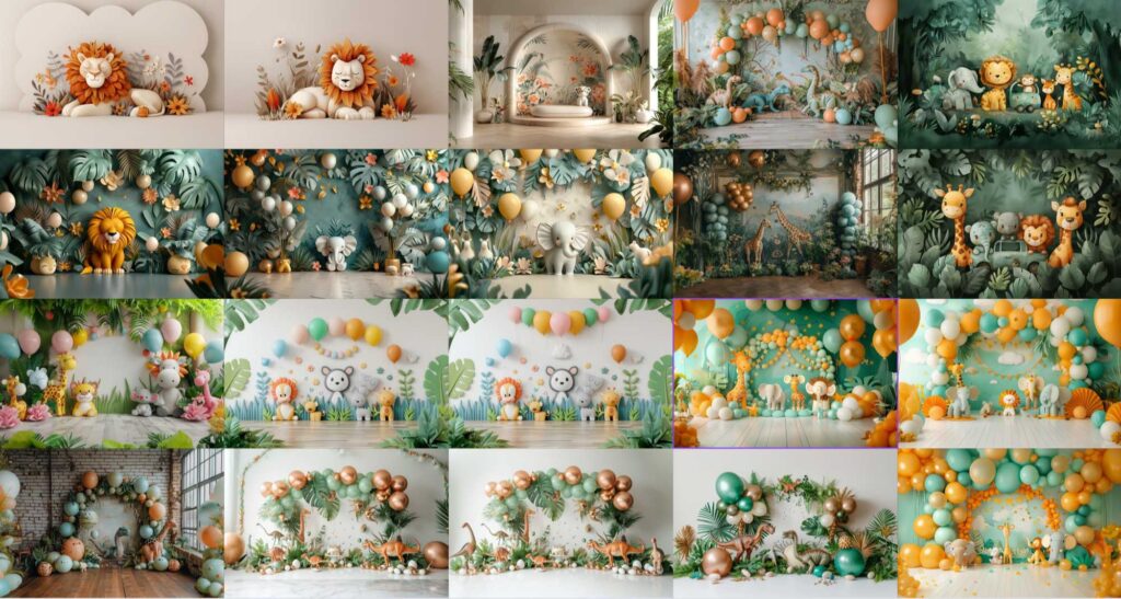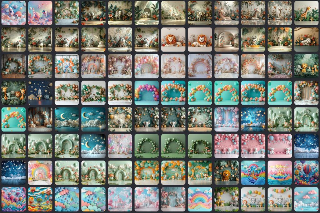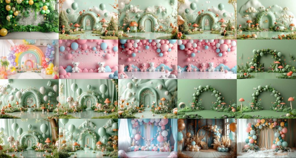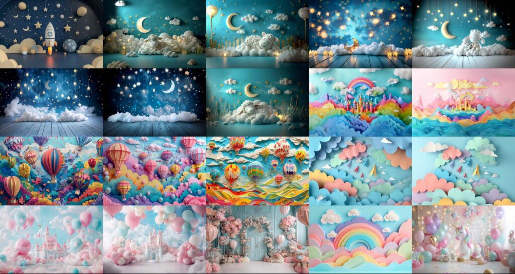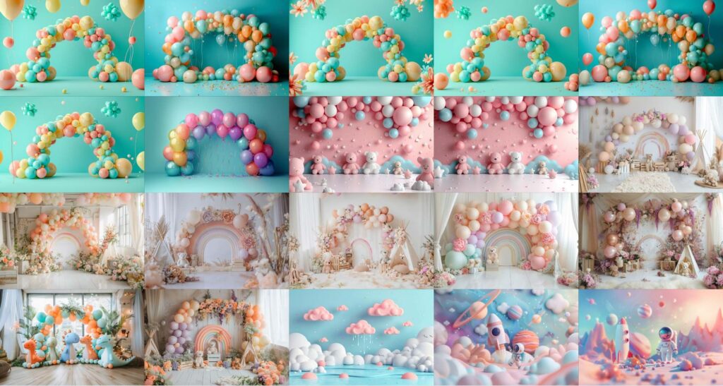 BAIXE AGORA 100 estilos incríveis, como balões em arco, animais da selva, arco-íris, castelos, balões de ar, céu noturno, ovelhas aconchegantes, dinossauros e muito mais.